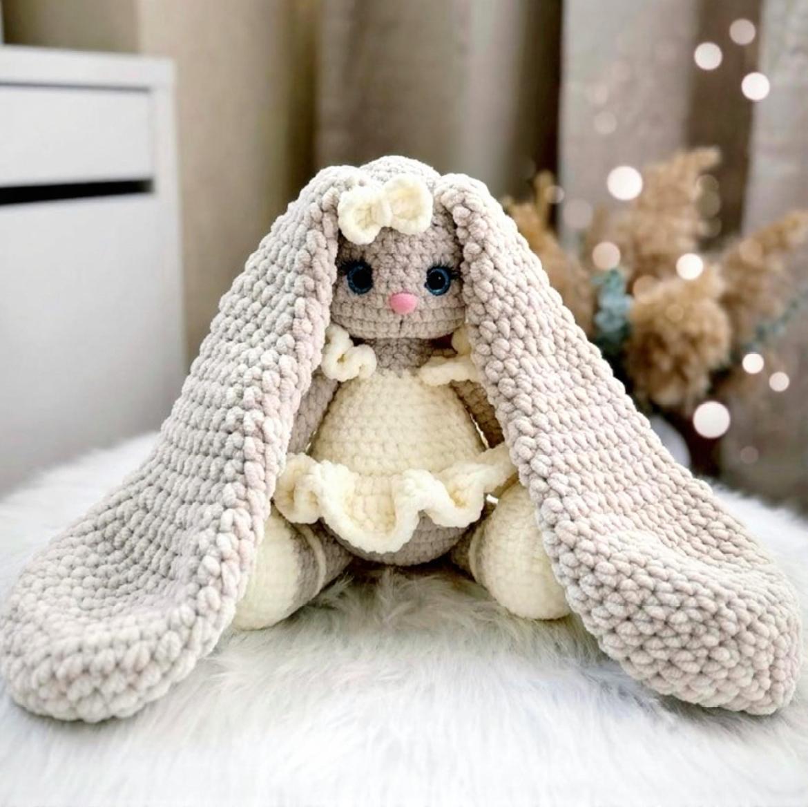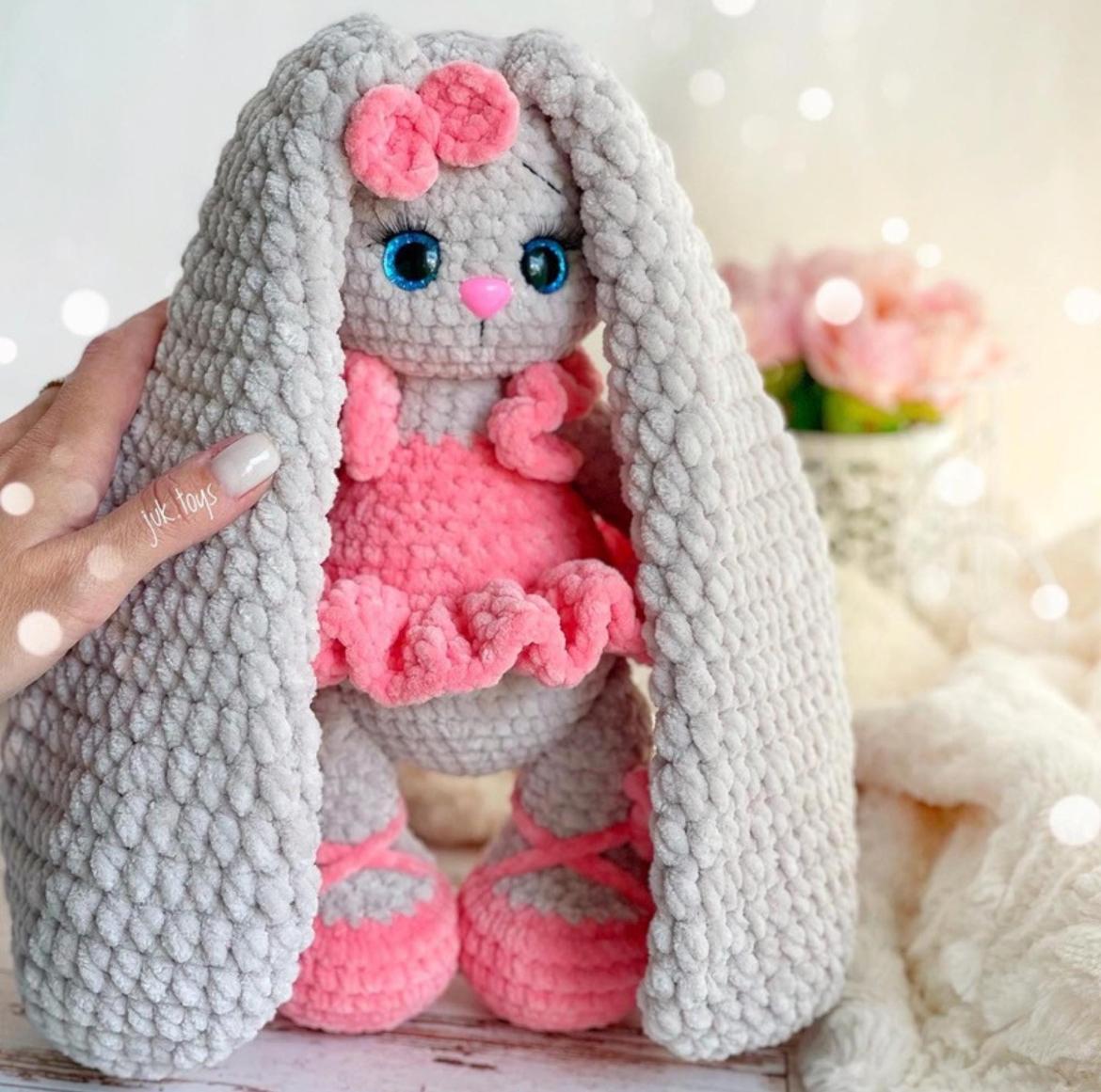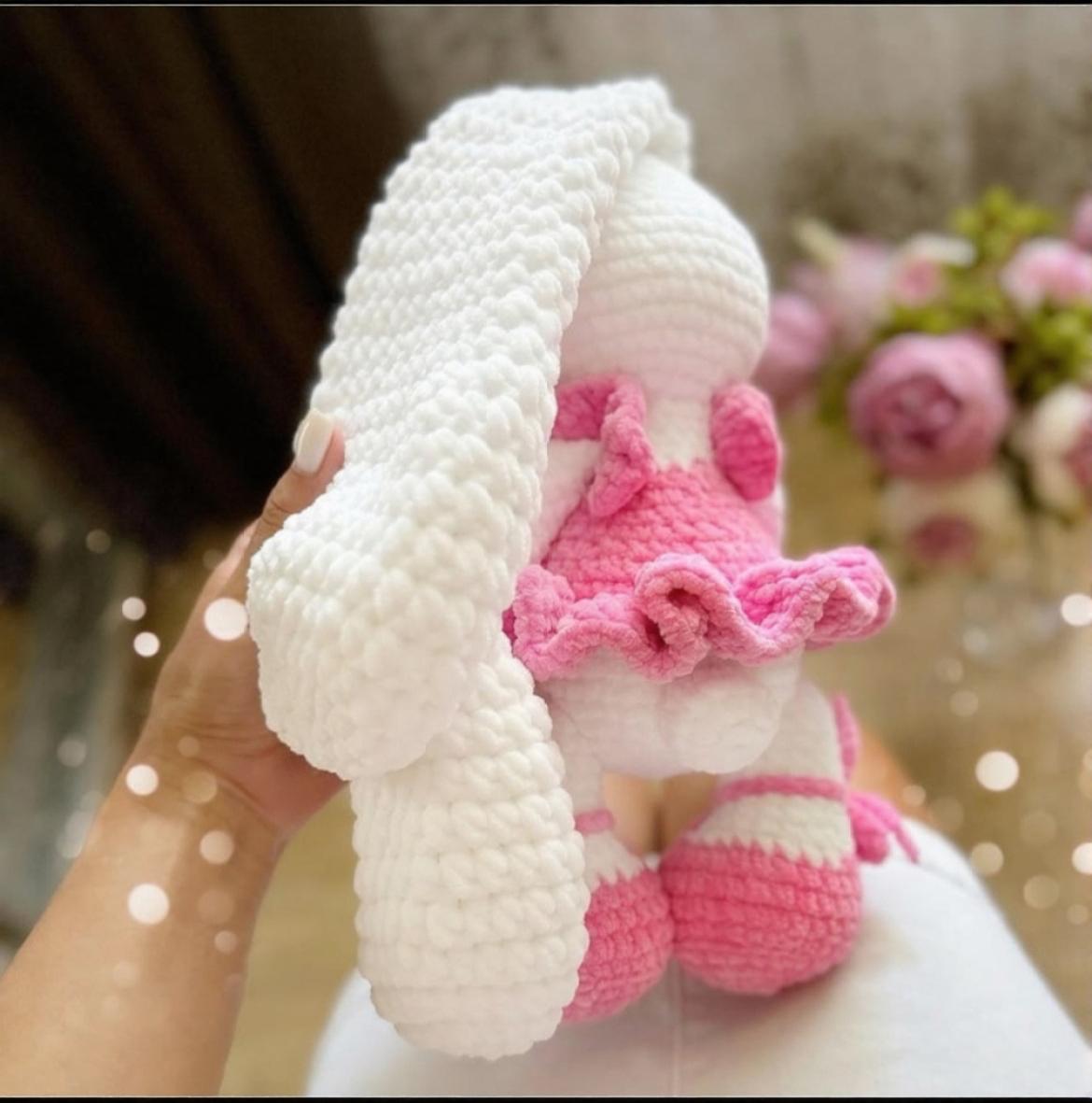 Ontmoet Mimi Konijn - een betoverend pluche amigurumi konijn met extra lange oortjes, schattig jurkje en pantoffeltjes! Perfect voor liefhebbers van zachte knuffels en romantische haakprojecten. 💕🌸