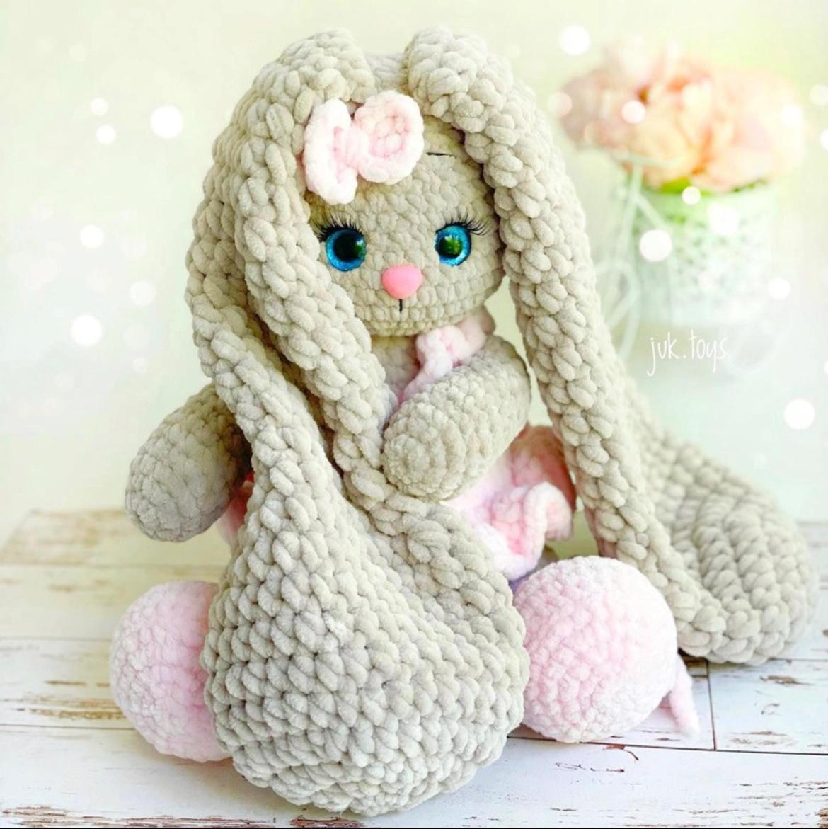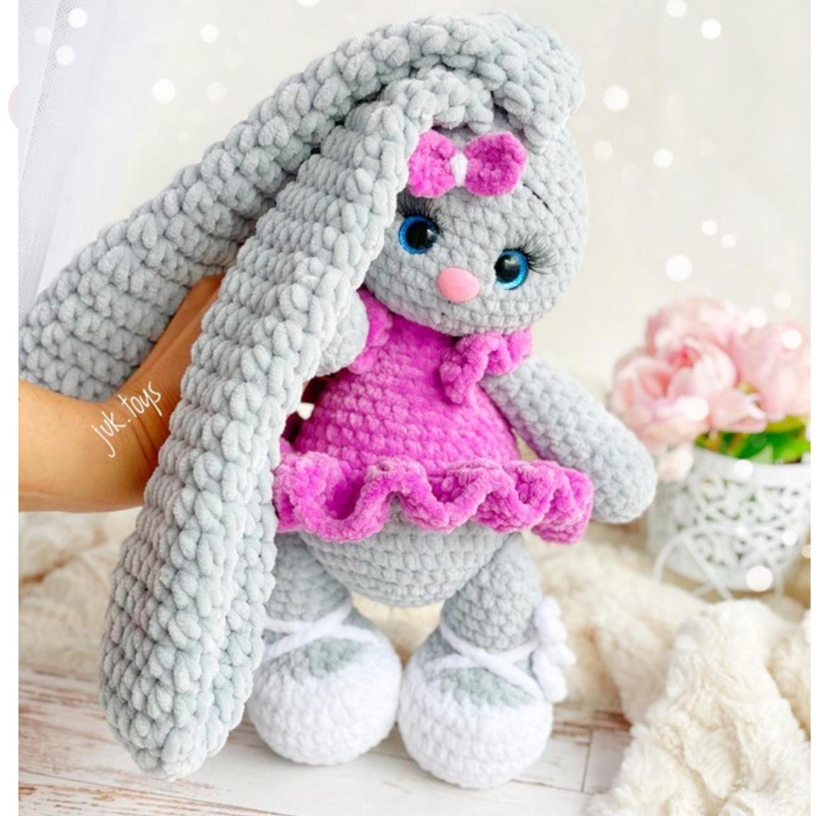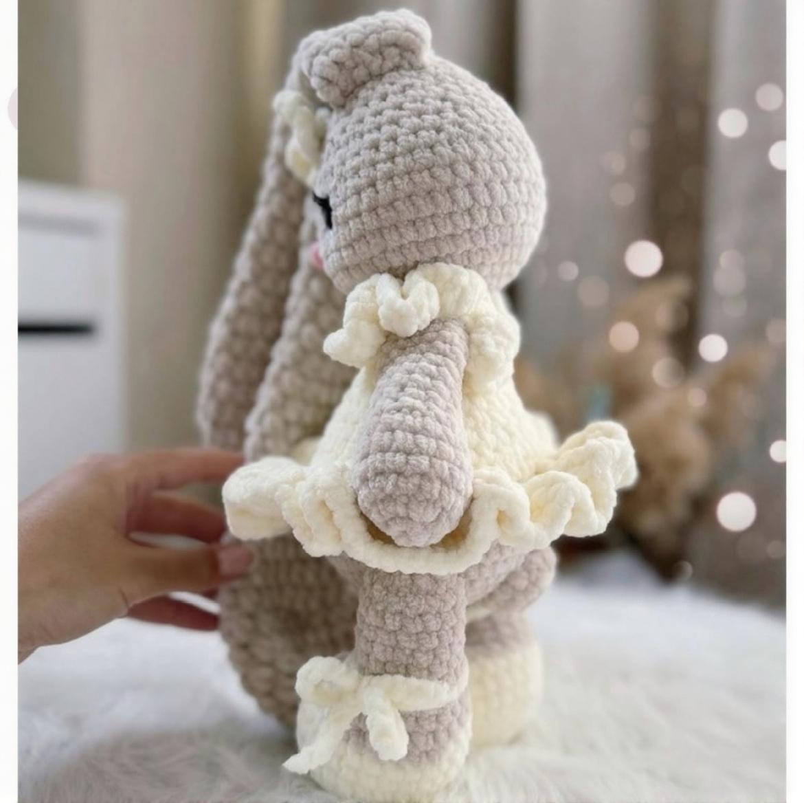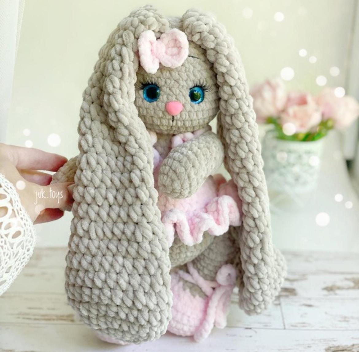 Ontmoet Mimi Konijn - een betoverend pluche amigurumi konijn met extra lange oortjes, schattig jurkje en pantoffeltjes! Perfect voor liefhebbers van zachte knuffels en romantische haakprojecten. 💕🌸